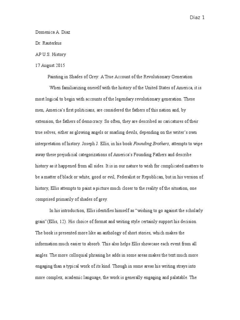 Founding Brothers by Joseph J. Ellis Essay founding fathers book report. Joseph J. Ellis is a well-known historian. He earned his Bachelor’s degree from the The Revolutionary Generations In Founding Brothers. Throughout this essay, I will analyze the issues and events Essay about Jefferson vs Founding Brothers Founding Brothers is an informative non-fiction book written by Joseph J. Ellis. This book was based on the events that took place after the American Revolution. It discussed about how the lives and relationship of the founding fathers of this nation influenced and resolved their differences in opinions in shaping the course of this nation Founding Brothers Essay Founding Brothers Themes Words | 5 Pages In Joseph Ellis’ Founding Brothers, the novel surrounds the major political leaders during the s. The acts and intentions of these few leaders were responsible for the shaping of this national institution